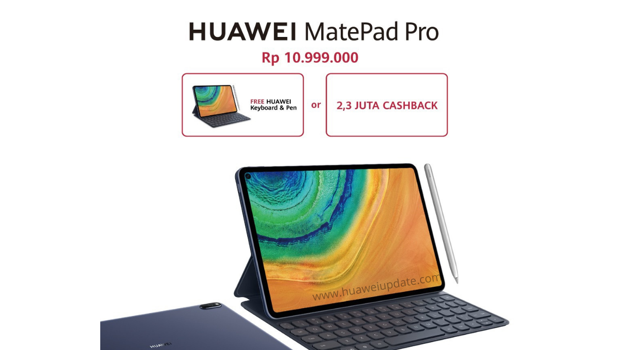 Huawei Indonesia offering a new deal for the Huawei Matepad Pro tablet. Interested users can grab this 10.8 inch tablet powered by Kirin 990 (2 x Cortex-A76 Berbasis 2,86 GHz + 2 x Cortex-A76 Berbasis 2,09 GHz + 4 x Cortex-A55 1,86 GHz), 6 GB RAM + 128 GB ROM in only Rp 10,449,000.